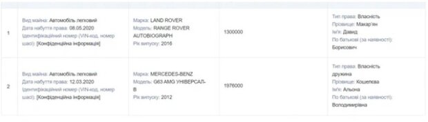 Что касается второй страсти – дорогих авто, то по состоянию на апрель 2021 года Давид Макарьян официально разъезжал на RANGE ROVER AUTOBIOGRAPH 2016 выпуска за 1 300 000 грн, который был приобретен в мае 2020 года. Его жена Кошелева Елена в это время курсировала MERCEDES-BENZ G63 AMG УНИВЕРСАЛ-В, за 1 976 000 грн, который также был приобретен в 2020 году, только в марте.