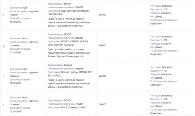 У начальника Департамента административно-хозяйственной деятельности ГТСУ Давида Макарьяна было официально задекларировано четыре штуки дорогих часов: наручные часы модель SPORTSTER – 264 000 грн. Ref 5827.2440AC – 224 000грн.