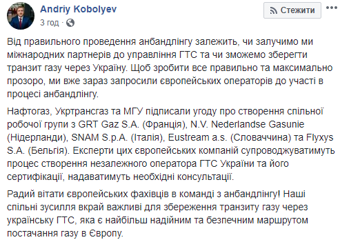 «Эксперты этих европейских компаний будут сопровождать процесс создания независимого оператора ГТС Украины и его сертификации, предоставлять необходимые консультации. Рад приветствовать европейских специалистов в команде по анбандлингу», — добавил Коболев.