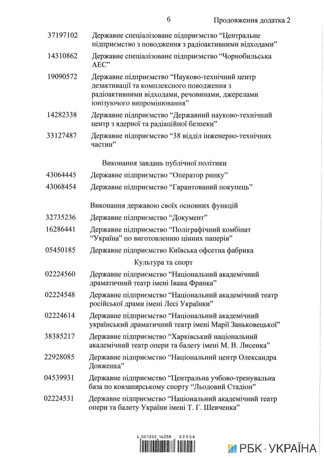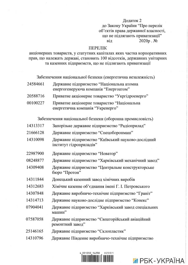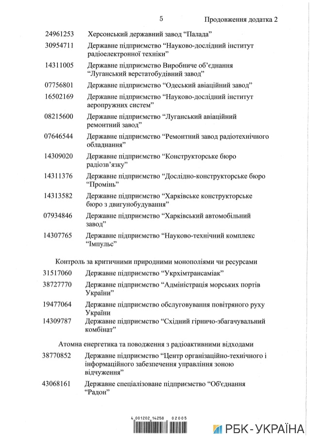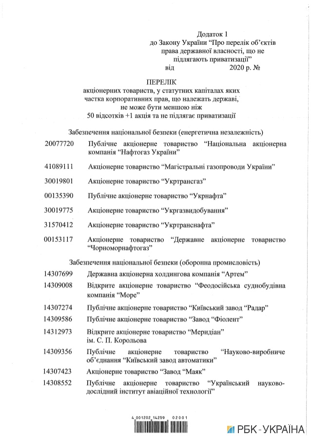 В сопроводительных документах указывается, что в перечень войдут «Нафтогаз», «Магистральные газопроводы Украины», «Укртрансгаз», «Укрнафта», «Укргаздобыча», «Укргидроэнерго», «Укрэнерго», «Энергоатом» и другие.