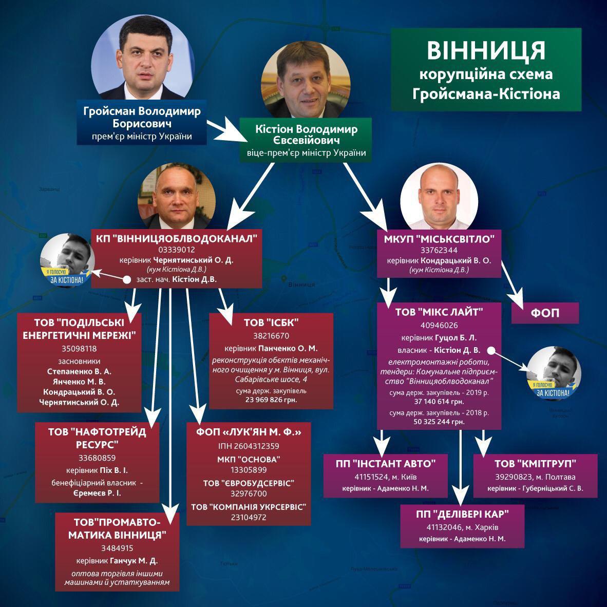 Те, кто изучал винницкие инновации освоения бюджетных средств, называют их «схемой Гройсмана-Кистиона». Эта схема проста и в своем жанре гениальна. Из государственного и местного бюджетов выделялись значительные средства на ремонт, реконструкцию и строительство объектов коммунальной инфраструктуры. Понимая лоббистские возможности премьер-министра Гройсмана относительно выделения средств для местных бюджетов, можно представить себе масштабы этих ассигнований. Не жалел Гройсман денег для Винницы, как видно из нашего расследования, по собственным вполне понятным мотивам.