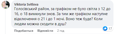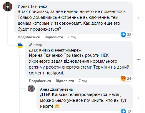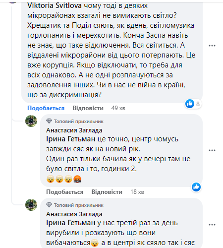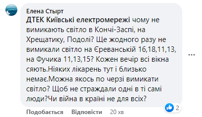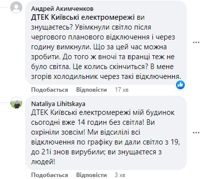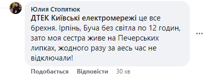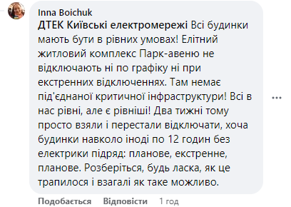 В элитных районах и пригородах Киева вообще не выключают электроэнергию, в то время как рядовые киевляне вынуждены оставаться без света длительное время. Такие комментарии начали оставлять жители Киева в Фейсбуке, на странице ДТЭК Киевские электросети 12 ноября, после того, как значительная часть Киева сидела без электричества почти весь световой день.