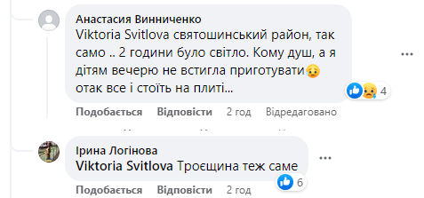 Как следует из комментариев, такая ситуация характерна для всех «спальных» районов и массивов Киева. В это же время элитные районы как в Киеве, так и в пригородах сияют огнями. Кроме того, в городе есть дома, которые по неизвестной логике никогда не отключают, хотя рядом нет ни больниц, ни других социально важных объектов.