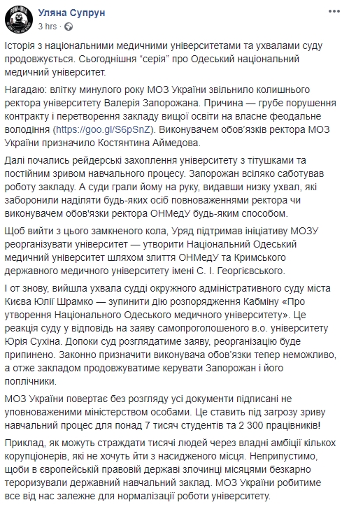 «Пока суд будет рассматривать заявление, реорганизация будет прекращена. Законно назначить исполняющего обязанности теперь невозможно, а следовательно заведением будет продолжать руководить Запорожан и его приспешники. МЗ Украины возвращает без рассмотрения все документы, подписанные неуполномоченными министерством лицами. Это ставит под угрозу срыва учебный процесс для более 7000 студентов и 2300 работников», — отметила Супрун.