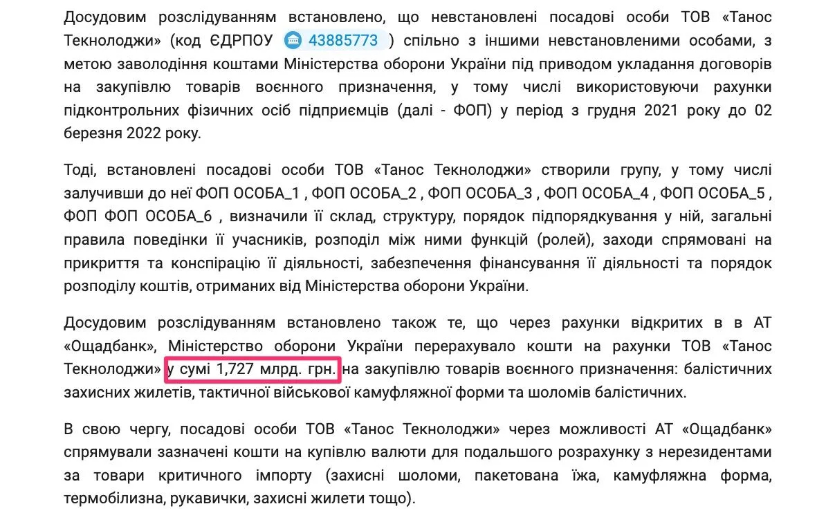 Эти средства через счета в АО «Сбербанк» Министерство обороны Украины перечислило на счета ООО «Танос Текнолоджи». Однако заказ так и не был выполнен, а деньги «исчезли» вместе с Николаем Петренко, которого Нацполиция объявила в международный розыск. Предполагается, что последний может скрываться от правосудия в Венгрии.