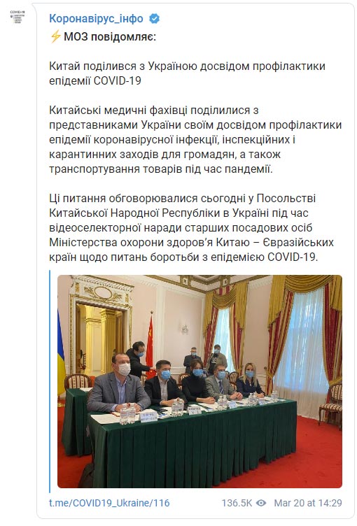 «Эти вопросы обсуждались сегодня в Посольстве КНР в Украине во время видеоселекторного совещания старших должностных лиц Министерства здравоохранения Китая — Евразийских стран по борьбе с эпидемией COVID-19», — говорится в сообщении.