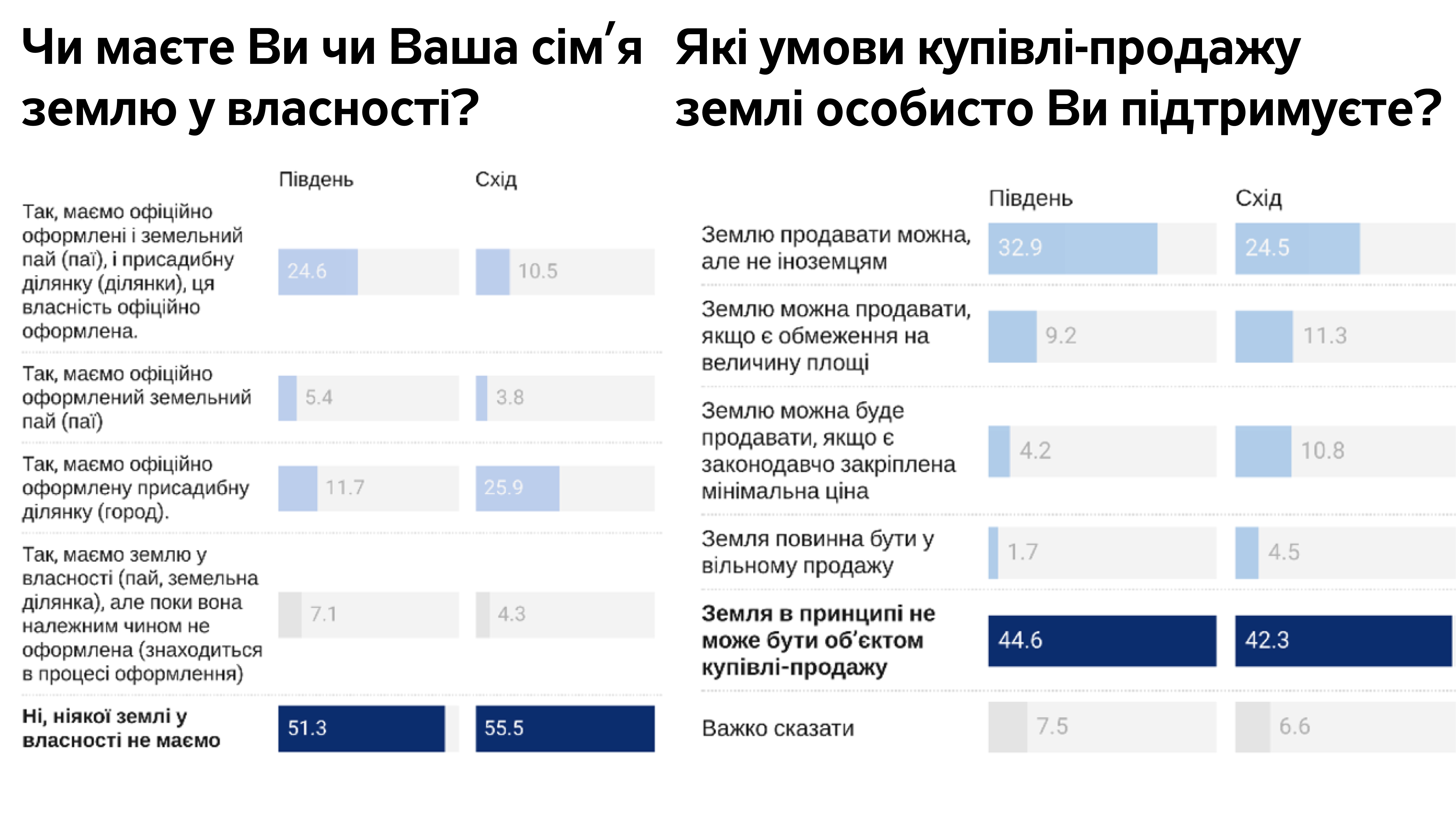 С другой стороны, в тех же группах, а иногда и те же люди утверждали, что свободное обращение земли будет способствовать приходу эффективных собственников, которые будут заинтересованы в установлении четкого правового регулирования и рыночной стоимости земли. Такие настроения больше заметны в Днепропетровской, Луганской, Черниговской, Черновицкой областях.