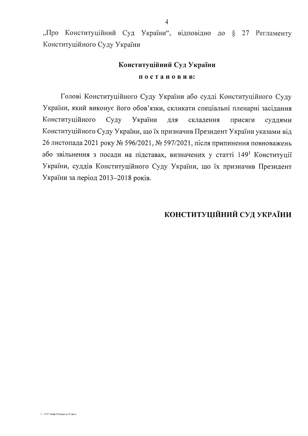 По этому поводу Конституционный суд принял специальное постановление об отсрочке присяги этими лицами, несмотря на то, что по Закону «О Конституционном Суде Украины» (ст. 17) специальное пленарное заседание Суда по приведению вновь назначенных судей КСУ к присяге должно состояться не позднее пятого рабочего дня со дня назначения судьи на должность, сообщает ZN.UA.