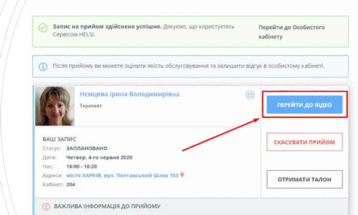 Далее система сигнализирует, что запись на прием осуществлена успешно. И, в определенное время, пациенту остается лишь выбрать опцию «перейти к видео».