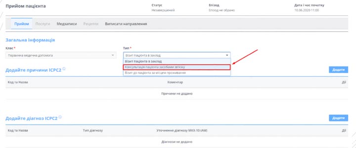 Единственное, что врач должен отметить тип консультации – средствами телекоммуникационной связи. Эту отметку необходимо сделать в общей информации, когда выбираете класс медицинской помощи и ее тип.