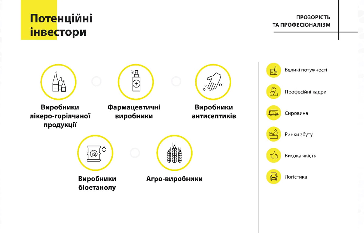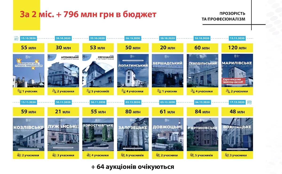В середине сентября 2020 года началась приватизация имущества госпредприятия «Укрспирт». На приватизацию первой волны попадет 41 завод из 78. По состоянию на 21 декабря 2020 года уже продано 16 заводов.