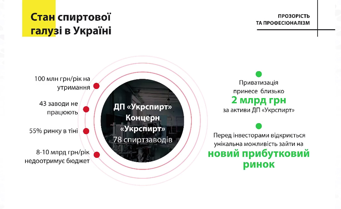 По словам заместителя главы Фонда госимущества (ФГИУ) Тараса Елейко, Украина была одной из двух стран в Европе, где существовала монополия на производство спирта. Второй была и осталась Беларусь.
