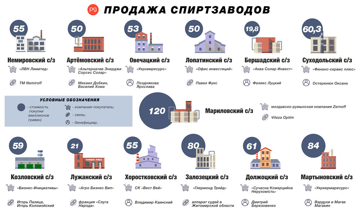 За Залозецкий спиртзавод в Тернопольской области конкурировали шесть компаний. Его продали за 80 млн грн киевской компании Глермонд Трейд, которая заплатила на 10 тыс. грн больше, чем ее ближайший конкурент на торгах. Конечный бенефициар Глермонд Трейд – Наталия Шлапак, работающая руководителем аппарата судей в Коростышевском районном суде Житомирской области. До нее бенефициаром был Александр Сахнюк, который работал в государственной исполнительной службе Знаменского района Кировоградской области.