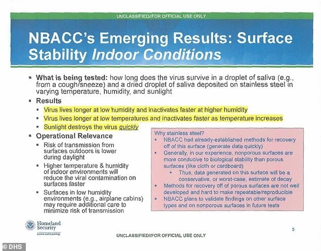 Как сообщает DailyMail, в СМИ попали документы министерства внутренней безопасности США, в которых утверждается, что коронавирус уничтожается солнечным светом. Якобы при высокой температуре и влажности COVID-19 не может выживать ни на различных поверхностях, ни в слюне человека, передает Обозреватель.
