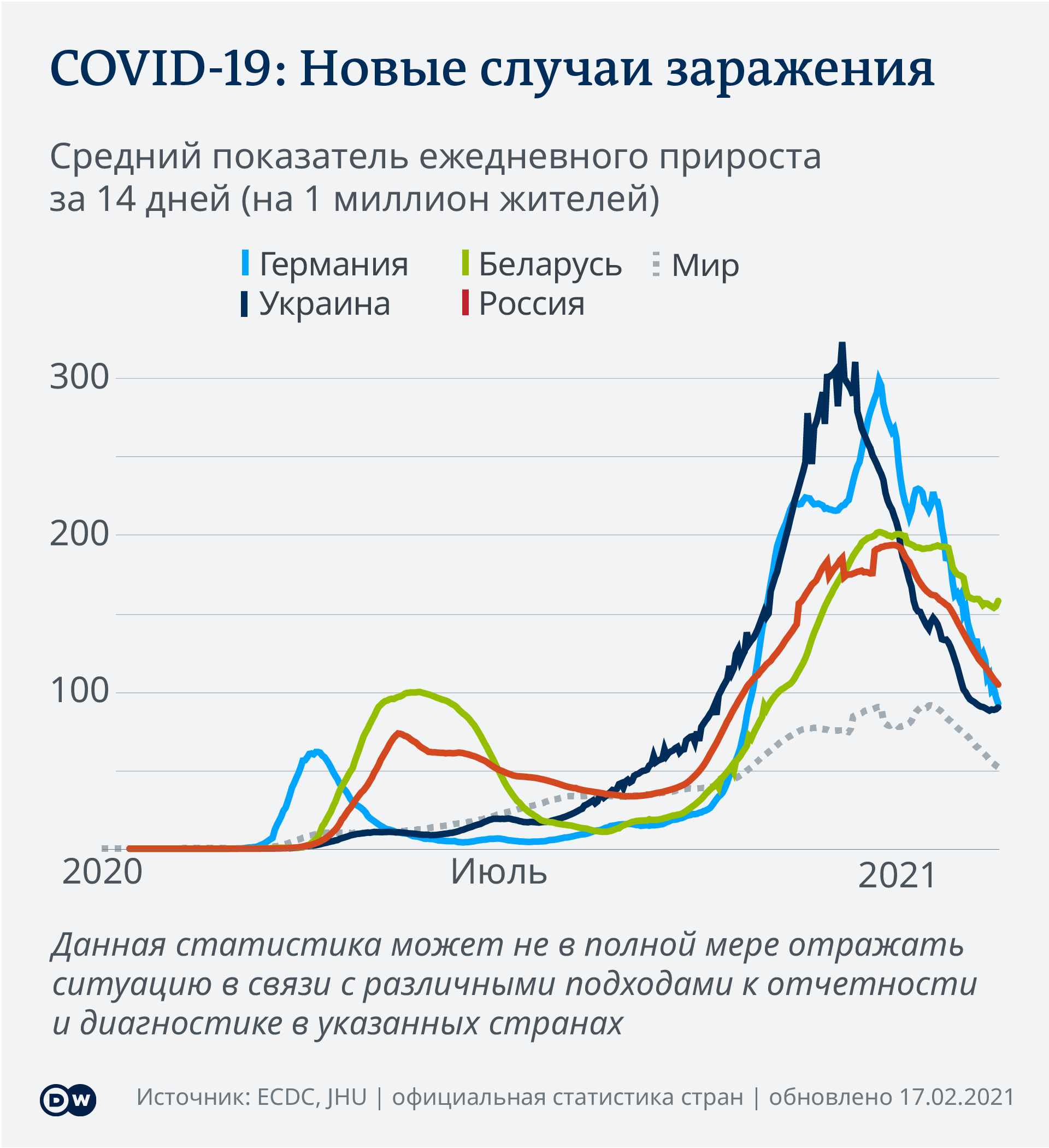 Мир продолжает бороться с пандемией COVID-19. Страны проводят вакцинацию населения. По данным сайта Worldometers, с начала коронавируса -CoV-2 инфекция выявлена более чем у 110 млн жителей планеты. Свыше 2,4 млн человек скончались с подтвержденным диагнозом COVID-19. Выздоровели более 84,9 млн пациентов. DW следит за событиями среды, 17 февраля (время московское).