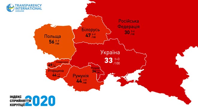 Украина поднялась в рейтинге на три балла и получила 33 балла из 100. В рейтинге наша страна находится рядом с Непалом, Египтом и Замбией. По данным Transparency International, текущая ситуация лучше в сравнении с 2019 годом. Тогда Украина делила 26-129-е места с Джибути, Азербайджаном и Кыргызстаном.