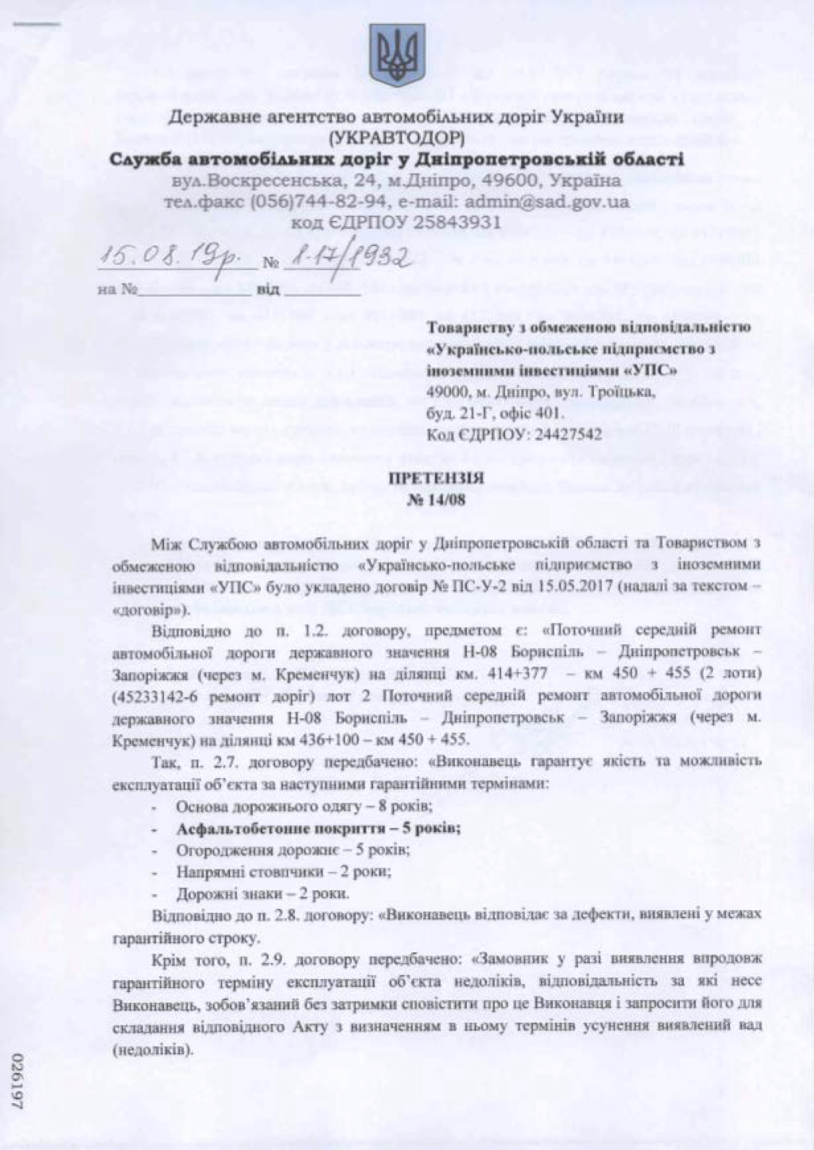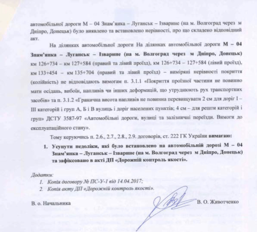 Результатом стали новые тендеры и новые выделенные средства, которые и привели к строительству некачественных дорог. Экспертиза госпредприятия «Дорожный контроль качества» дала заключение, что дорожное покрытие необходимо отремонтировать. Разумеется, за счет подрядчика по гарантии. О чем «Укравтодор» уведомил УПС.