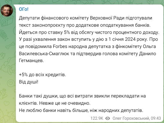 «Об этом сообщила Forbes народный депутат из финкомитета Ольга Василевская-Смаглюк и подтвердил глава комитета Даниил Гетьманцев. Далее нардеп добавил: +5% ко всем кредитам. От души! Банки такие душки, что все расходы привыкли переводить на клиентов. Неужели это не очевидно? Не люблю банки даже больше народных депутатов «, — подчеркнул Гороховский.