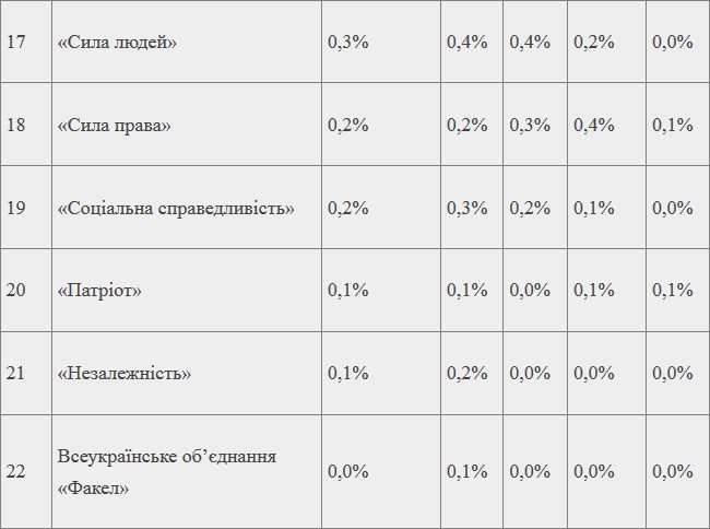 22:05 Социологи показали окончательные результаты Национального экзит-пола. В Раду проходят пять партий. Статистические шансы все еще имеетпартия «Сила и честь». Сейчас у нее 4.3%.