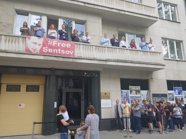 12:08 Участок в Варшаве. Перед его открытием люди исполнили гимн. На здании посольства размещен баннер с призывом освободить Олега Сенцова.