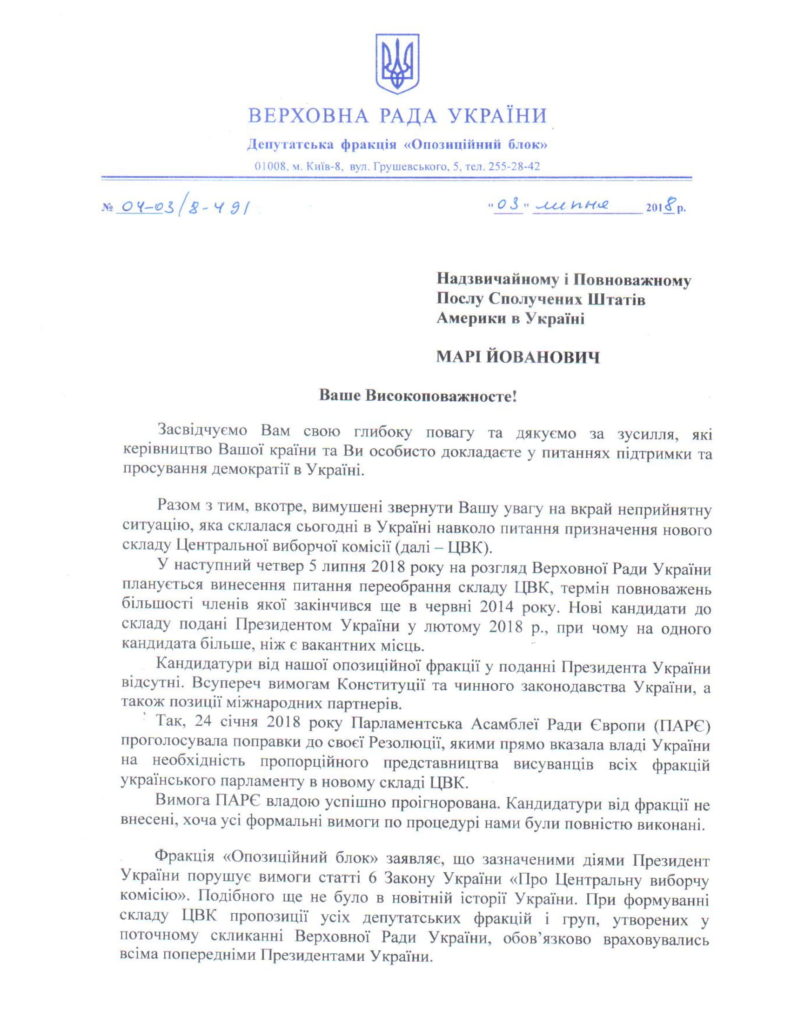 В письме, в частности, отмечается, что выборы, которые скоро пройдут в Украине, должны быть честными, прозрачными и объективными, а лишение «Оппозиционного блока» законного права быть представленными в составе Центральной избирательной комиссии прямо угрожает их легитимности.