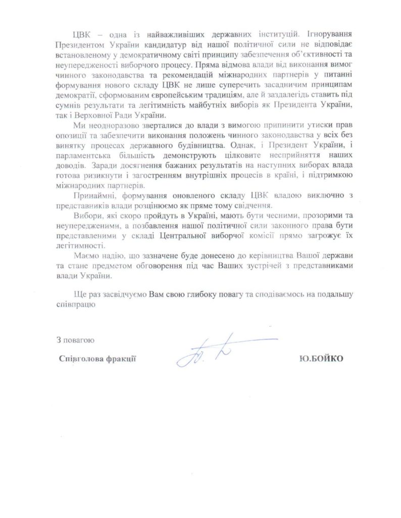 «Мы неоднократно обращались к власти с требованием прекратить притеснения прав оппозиции и обеспечить выполнение положений действующего законодательства во всех без исключения процессах государственного строительства. Однако, и Президент Украины, и парламентское большинство демонстрируют полное неприятие наших доводов. Ради достижения желаемых результатов на следующих выборах власть готова рискнуть и обострением внутренних процессов в стране, и поддержкой международных партнеров. По крайней мере, формирования обновленного состава ЦИК властью исключительно из представителей власти расцениваем как прямое тому свидетельство», — подчеркивается в письме.
