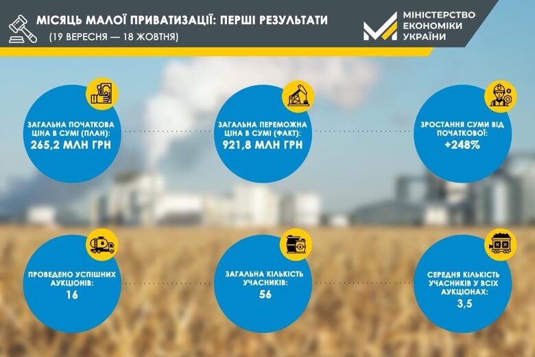 «В Украине идет малая приватизация, в рамках которой государство выставляет на торги небольшие предприятия. Онлайн-аукционы стартовали 19 сентября, и за первый месяц (по 18 октября включительно) было продано 16 объектов на сумму победных ставок, которая составила 921,8 млн грн», – говорится в сообщении.