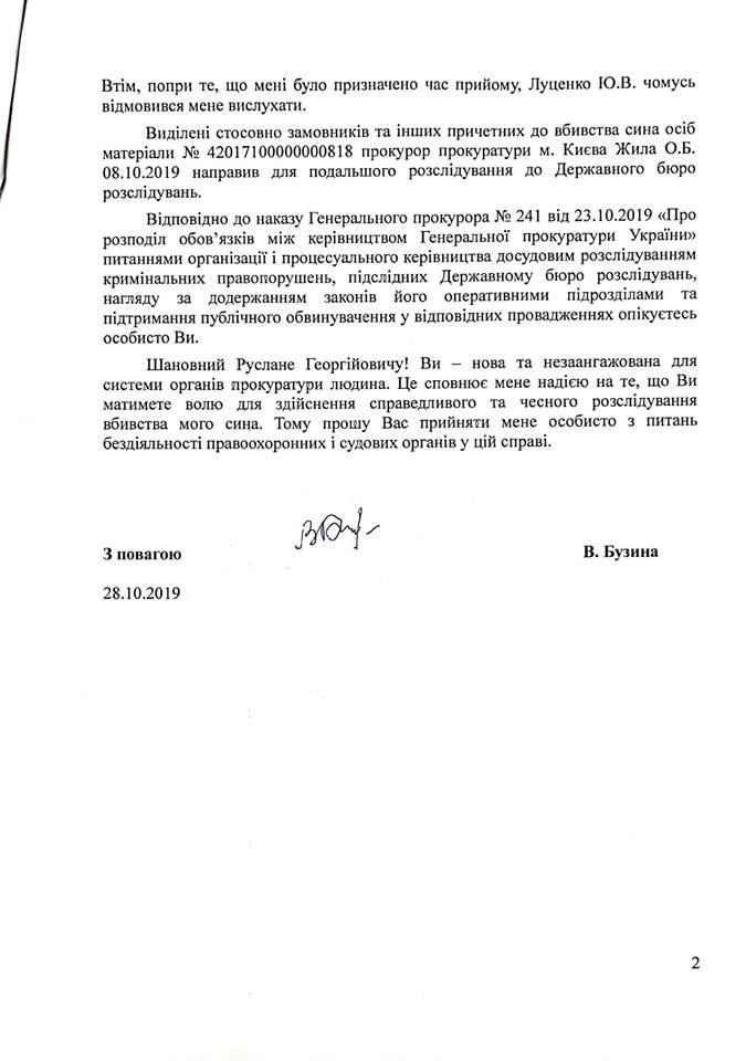 Мать убитого писателя Олеся Бузины попросила генпрокурора Рябошапку о личном приеме