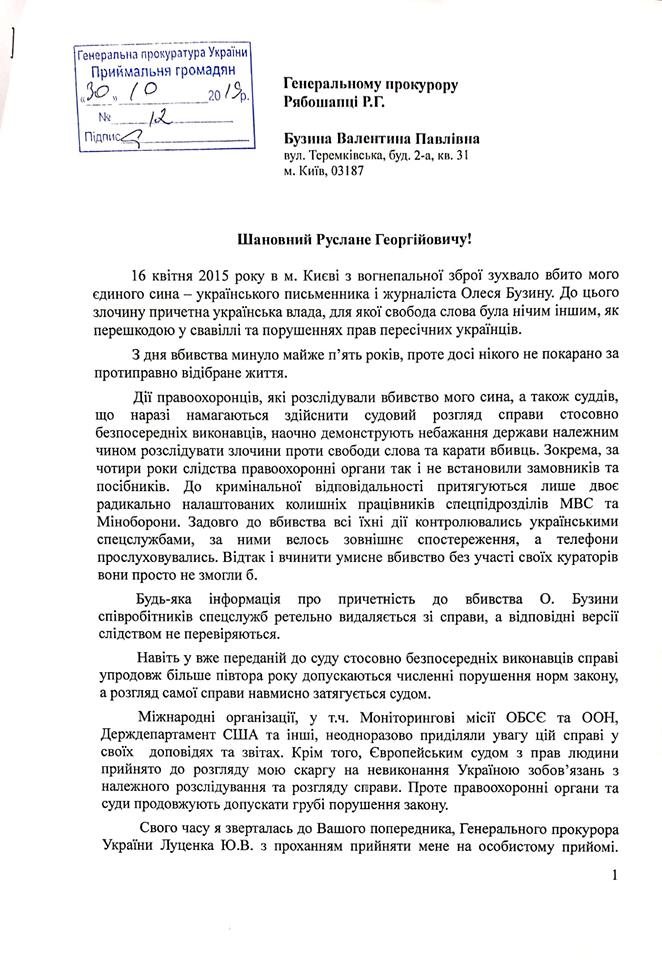Мать убитого в 2015 году украинского писателя Олеся Бузины Валентина Павловна направила генпрокурору Руслану Рябошапке обращение с просьбой о личном приеме