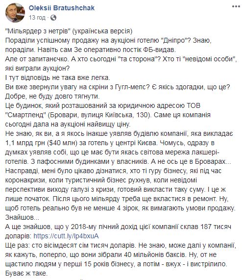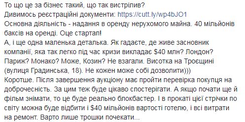 «Что это за бизнес такой, что так выстрелил? Смотрим регистрационные документы. Основная деятельность — предоставление в аренду недвижимого имущества. 40 млн долларов на аренде. Это стартап! А, и еще одна маленькая деталька. Как думаете, где живет основатель компании, которая так легко во время кризиса выкладывает $40 млн? Лондон? Париж? Монако? Может, Козин? Не вообще. Высотка на Троещине (ул Градинская, 18). Не каждый может себе позволить))) Короче. После завершения аукциона должна пройти проверка покупателя на доброчесность. За этим тоже будет интересно наблюдать. А если начать еще и фильм снимать, то это будет реально блокбастер. И в прокате этой ленты в мире можно будет отбить и $40 млн стоимости отеля, и все расходы на ремонт. Стоит лишь немного подождать», — резюмировал Братущак.