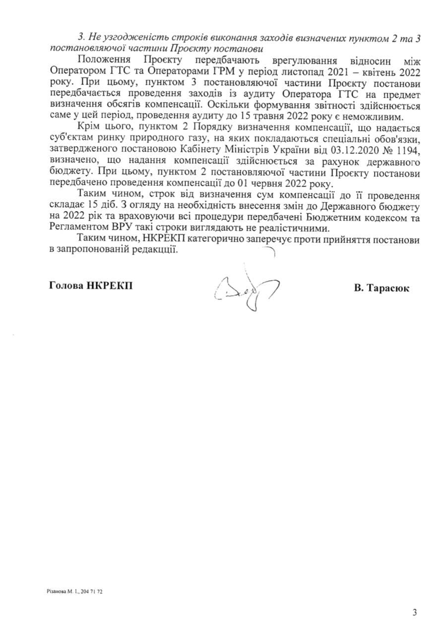 НКРЭКУ обращает внимание, что нормы проекта постановления о введении ПСО противоречат сами себе и действующему законодательству. Например, обязать ОГТСУ поставлять газ любому, значит нарушить закон «О рынке природного газа». Ведь оператор не может вести деятельность по добыче, распределению или поставке природного газа. Кроме того, регулятор видит опасность в отборе газа ОГТСУ в пользу облгазов как для финансовой, так и для технической стабильности газотранспортной системы.