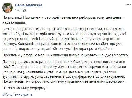 Министр юстиции Украины Денис Малюська заявил, что существование моратория на продажу земли нарушает Конвенцию по правам человека и основных свобод