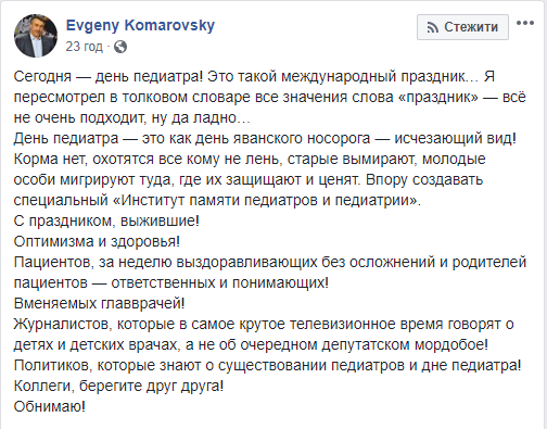 “День педиатра это как день яванского носорога — исчезающий вид! Корма нет, охотятся все кому не лень, старые вымирают, молодые особи мигрируют туда, где их защищают и ценят. Впору создавать специальный «Институт памяти педиатров и педиатрии»”, — пишет теледоктор в своем поздравительном обращении в Фейсбуке.