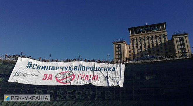 Активисты разместили 30-метровый плакат с надписью «СвинарчуковПорошенко за решетку» на фасаде ТРЦ «Глобус» на Майдане Независимости.