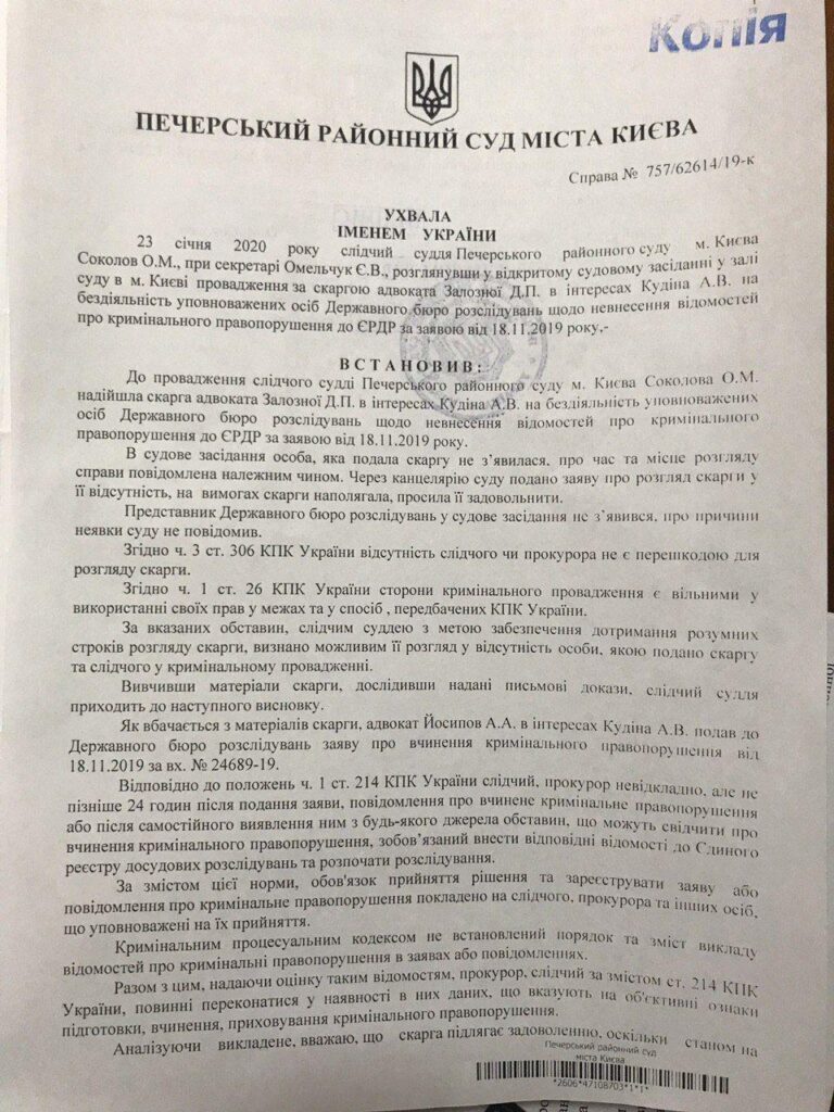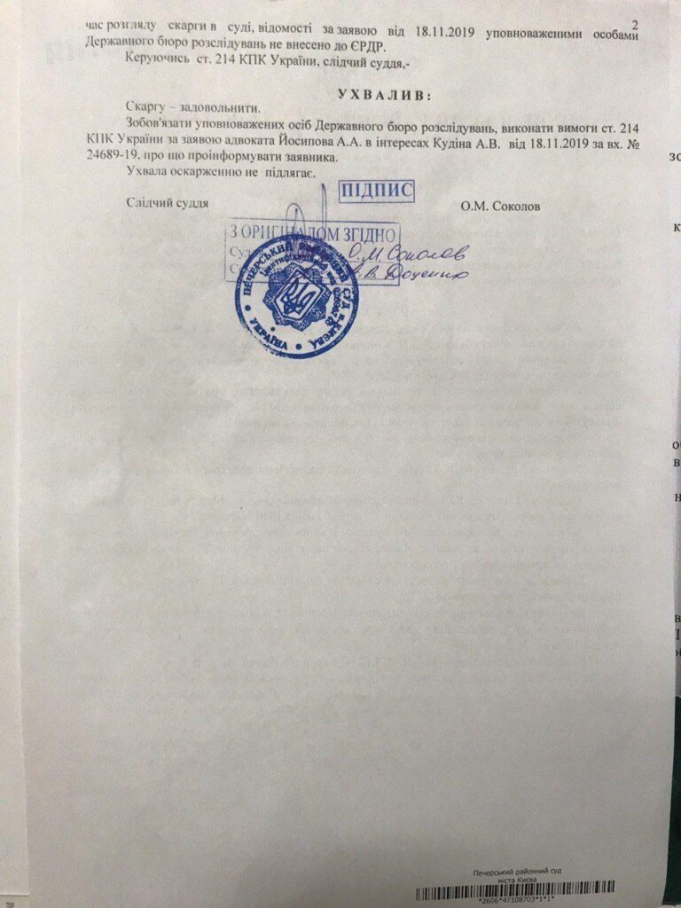 «Печерский районный суд города Киева своим постановлением обязал уполномоченных лиц Государственного бюро расследований внести сведения в Единый реестр досудебных расследований и начать расследование», – сказано в публикации.