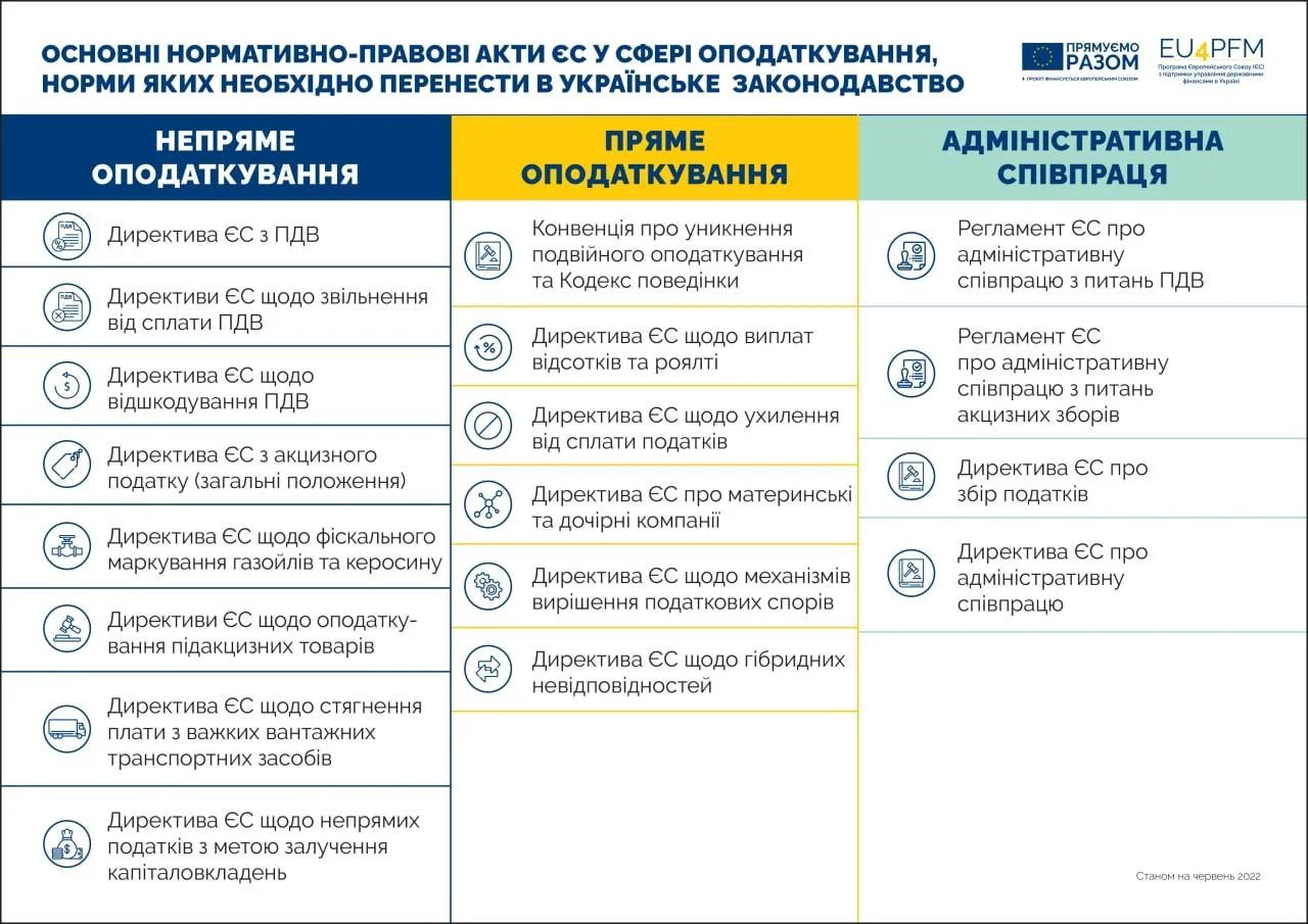 Для стран-кандидатов это предполагает подготовку сотен и даже тысяч страниц разных законопроектов. В связи с этим Налоговый кодекс Украины также может быть значительно изменен. Существует около двадцати директив, нуждающихся в гармонизации, и только два нормативных акта уже непосредственно имплементированы и не нуждаются в изменениях в действующем законодательстве.