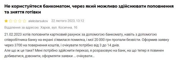 «Хотел пополнить карточный счет с помощью банкомата, даже с помощью сотрудника банка, на экране появилась ошибка, и мои 20 000 грн пропали без вести. Оформил заявку через 3700 на возврат средств и ожидать нужно от 3 до 14 дней. Но что же это такое? Мне нужно осуществить перевод, я рассчитываю на банк, почему теперь я должен добиваться, звонить, оформлять заявки… Ждать…», — рассказал недовольный клиент «ПриватБанка».