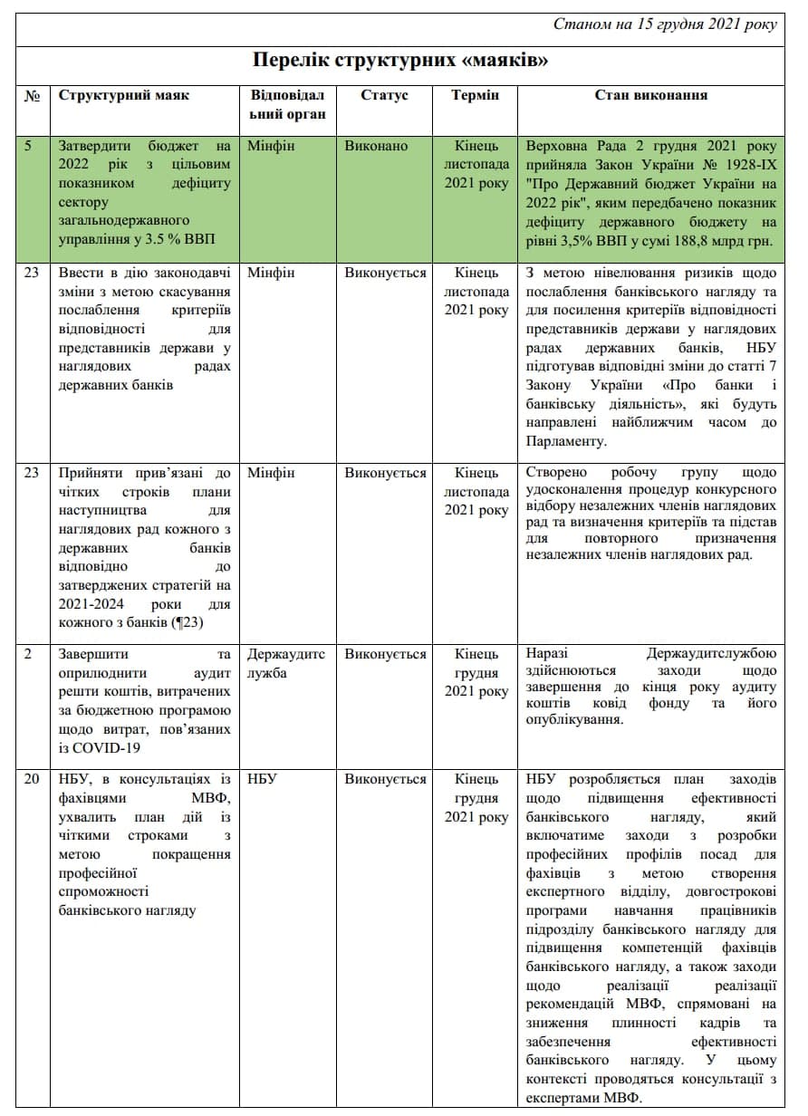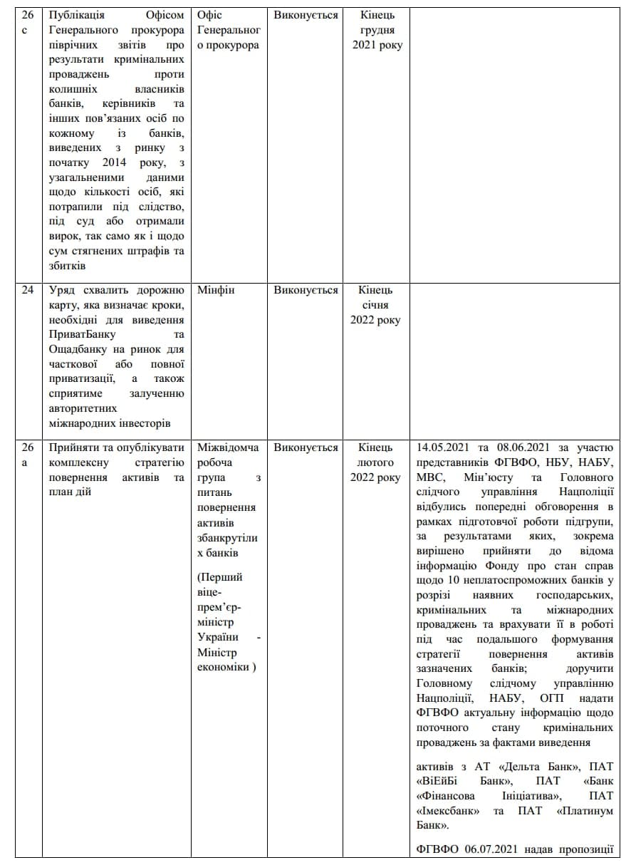 В соответствии с программой Stand-by-2020 два транша уже получено. Однако отмечен факт переноса сроков получения очередных кредитов: с мая 2021 г. – на март 2022 г., и с октября 2021 г. на июнь 2022 г. Для их получения правительству придется выполнить еще шесть «маяков». В частности, ПриватБанк и Ощадбанк должны принять дорожные карты приватизации, а Кабмин утвердить их. По мнению МВФ это «будет способствовать привлечению авторитетных международных инвесторов». Но, ПриватБанк и Ощадбанк являются крупнейшими держателями вкладов украинского народа. Их приватизация в нынешней непрозрачной экономической системе с большой долей вероятности будет проведена с коррупционной составляющей.