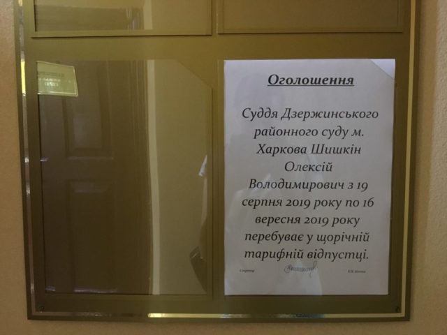 Причина – отпуск судьи Дзержинского районного суда города Алексея Шишкина, передает UA: Харьков.