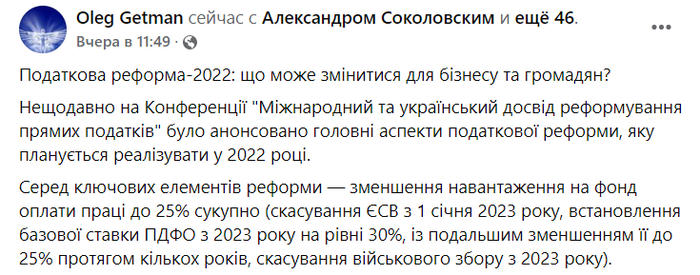 В Украине было анонсировано главные аспекты налоговой реформы, которую планируется реализовать в 2022 году. Об этом сообщил координатор экспертных групп Экономической экспертной платформы Олег Гетман в Facebook.