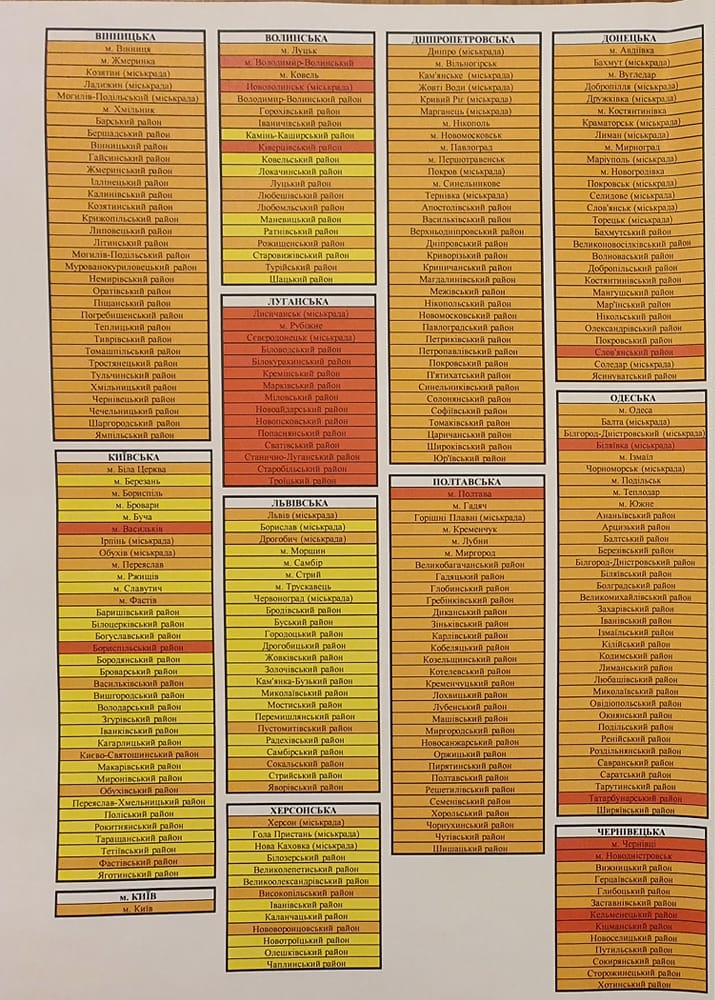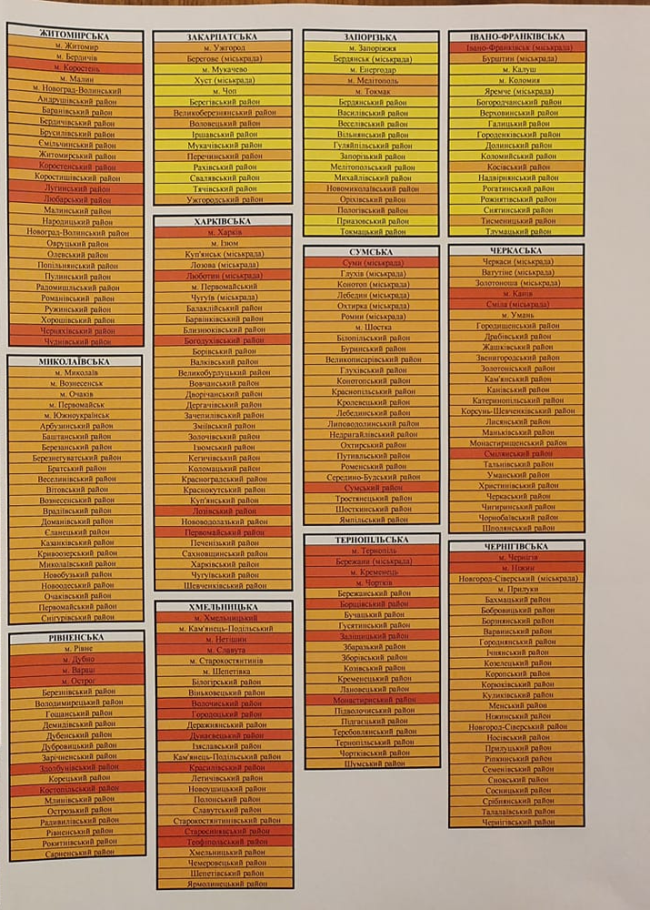 Большинство же территории страны, включая Киев, находится в оранжевой зоне. В желтой при этом находится большинство районов Ивано-Франковской, Закарпатской, Запорожской, Киевской, Львовской и Херсонской областей.