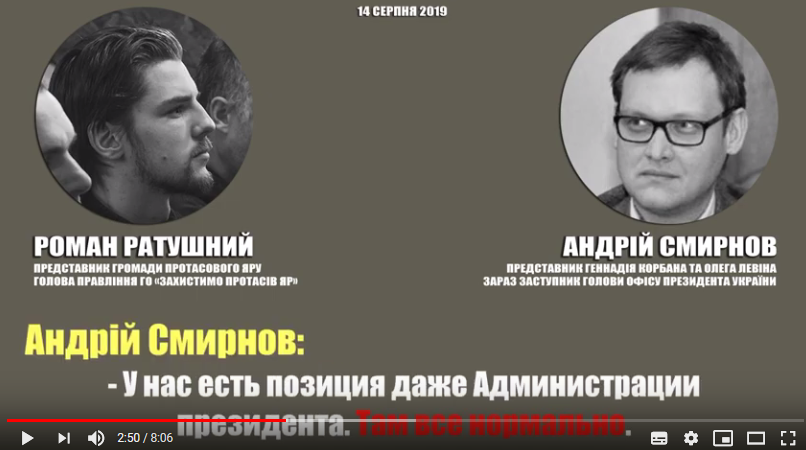 О своей встрече с Андреем Смирновым Роман вспоминает так: «Это было 14 августа. Первые 20 минут он хотел узнать, сколько мне нужно денег, чтобы я перестал заниматься тем, чем занимаюсь – перестал мешать строиться. Потом убеждал, что надо договариваться. Корбана и Левина называл клиентами. А, поняв, что речь не идет о получении благ, стал рассказывать, что будет, если мы не договоримся. Говорил, что он только что от Романа Трубы, хвалился связями в Офисе Президента. Хвастал, что и Коломойского может набрать».