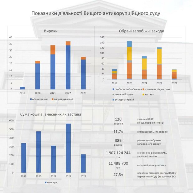 Также характеризующей особенности деятельности можно назвать информацию о сумме средств, внесенных на счет ВАКС в виде залога. За все время она составила 1,9 млрд гривен . И, если эту сумму разделить на 166 всех решений по этому виду меры пресечения, то можно сделать вывод, что средний размер залога в ВАКС составляет 11,5 млн. гривен. Довольно высокая имущественная планка, не правда ли?
