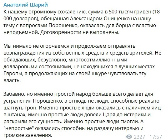В частности, как отмечает Шарий, Онищенко обещал профинансировать кампанию по провокационным вопросам Порошенко на сумму в 500 тысяч гривен, однако денег так и не предоставил.