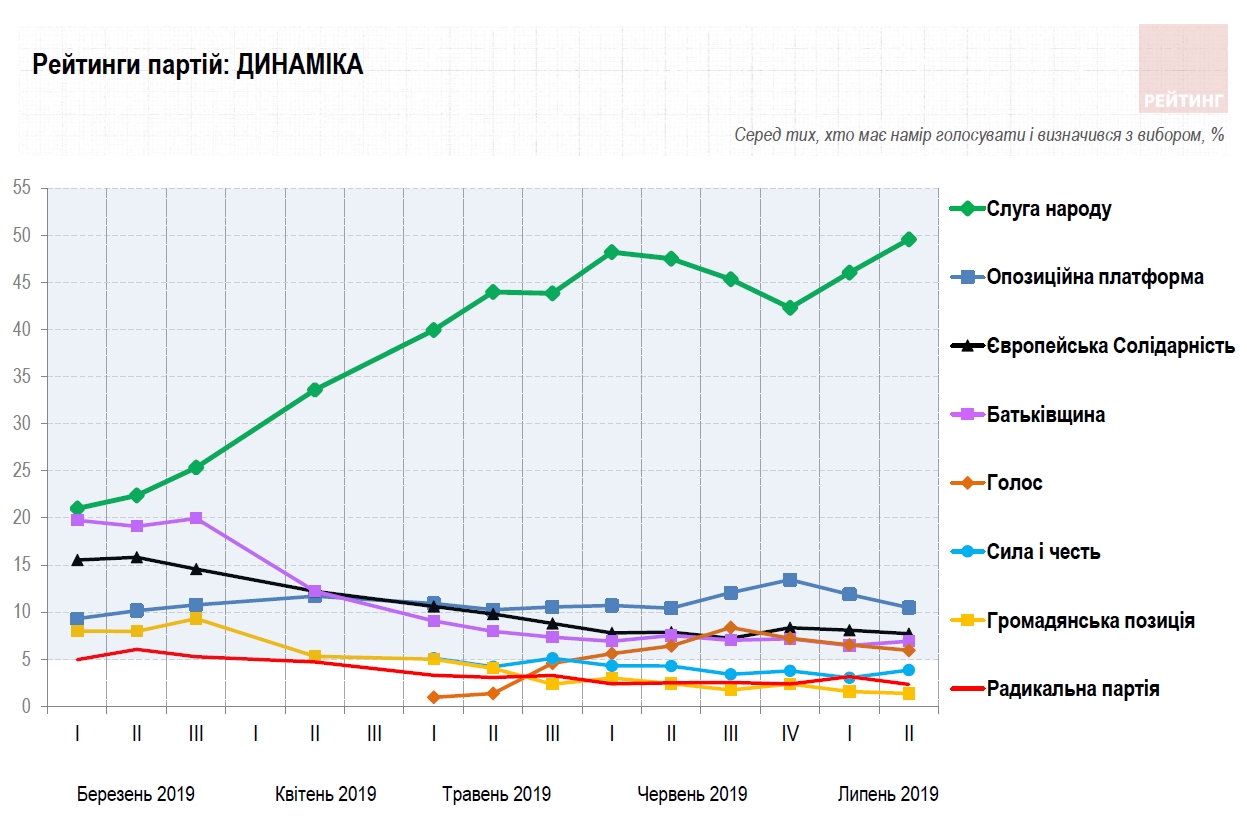 Рейтинг партии Зеленского вырос до 50%, поддержка других партий снижается