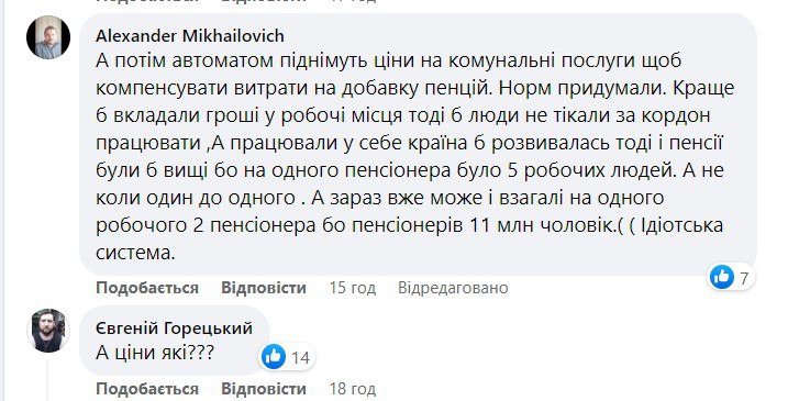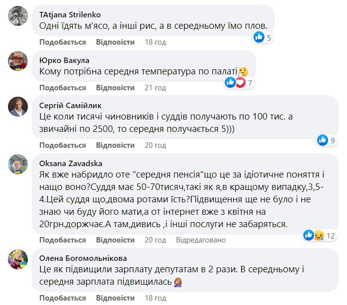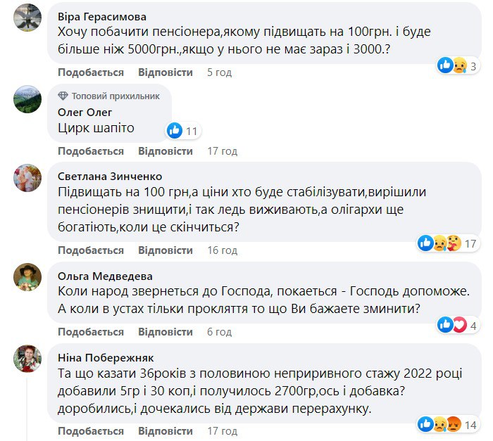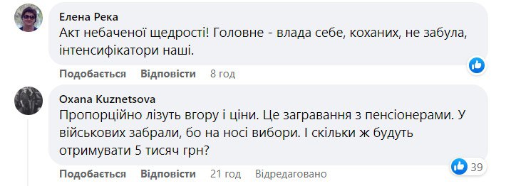 «Хочу увидеть пенсионера, которому повысят на 100 грн и будет больше 5 тысяч, если у него нет сейчас и 3 тысяч?», «Акт невиданной щедрости! Главное — власть себя любимых не забыла, итенсификаторы наши», «Пропорционально лезут вверх и цены. Это заигрывание с пенсионерами. У военных забрали, потому что на носу выборы. И сколько же будут получать 5 тысяч гривен?», «Одни едят мясо, другие – рис, а в среднем едим плов», «Это когда тысячи чиновников и судей получают по 100 тысяч, а обычные по 2 500, то средняя получается 5», — пишут комментаторы.