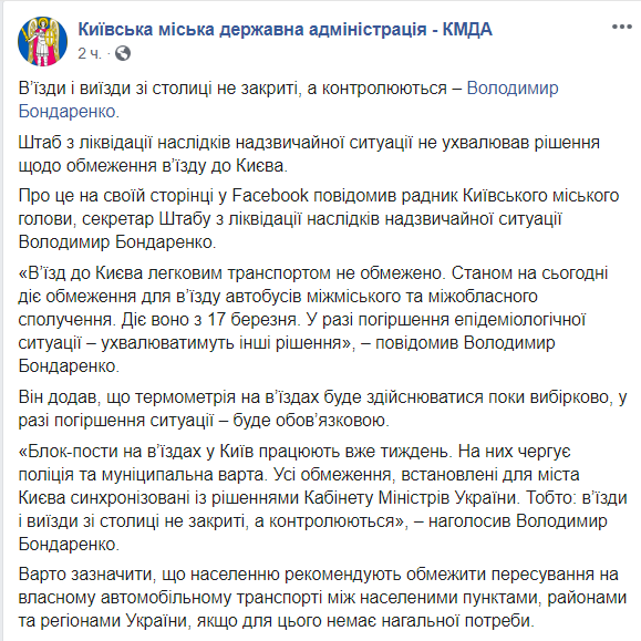 Въезды и выезды из столицы не закрыты, а контролируются. А штаб по ликвидации последствий чрезвычайной ситуации не принимал решения об ограничении въезда в Киев. Об этом на своей странице в Facebook сообщил советник Киевского городского головы, секретарь Штаба по ликвидации последствий чрезвычайной ситуации Владимир Бондаренко.
