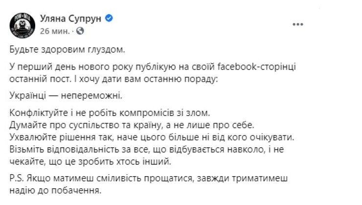 Бывшая и.о. министра здравоохранения Ульяна Супрун в первый день 2021 года написала пост на Facebook, в котором сообщила, что больше писать на этой странице не будет. Она также посоветовала украинцам «конфликтовать и не идти на компромисс со злом». Такой же пост появился и на ее странице в Twitter.
