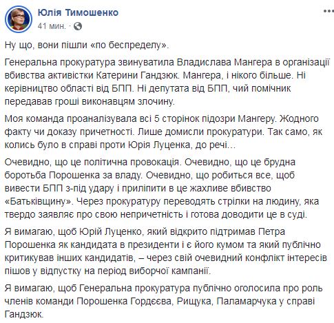 «Ну что, они пошли «по беспределу». Генеральная прокуратура обвинила Владислава Мангера в организации убийства активистки Екатерины Гандзюк. Мангера, и никого больше. Ни руководство области от БПП. Ни депутата от БПП, чей помощник передавал деньги исполнителям преступления», — отметила Тимошенко. По ее словам, в подозрении Мангеру нет ни единого факта или доказательства его причастности к преступлению, только домыслы прокуратуры.