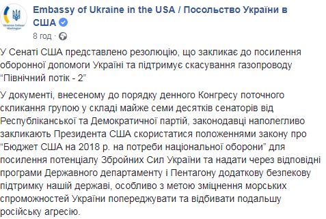 Об этом сообщается на странице посольства Украины в США в Facebook: